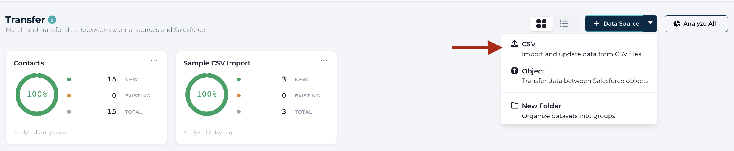 To start, click on the Transfer module then select Data Source > CSV to start the wizard.