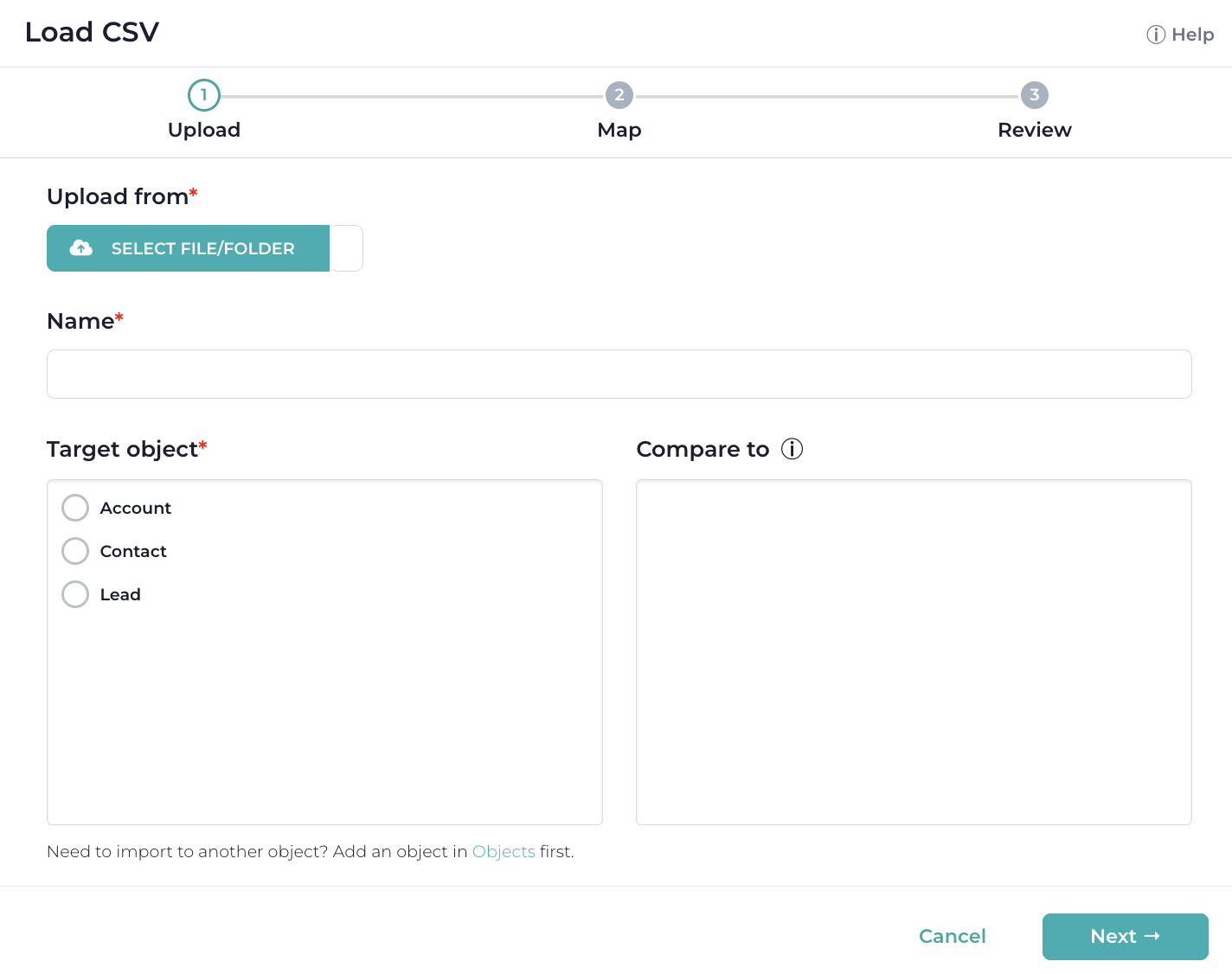 The Transfer module allows users to load spreadsheets (CSV files) and then compare them to existing data in Salesforce in order to identify and prevent duplicates from being imported. Since this process identifies duplicates, it can also be used to update or enrich existing Salesforce records with the data from CSV files. Data sources for CSV file import can originate from a local device, Salesforce, FTP or from an AWS S3 storage.