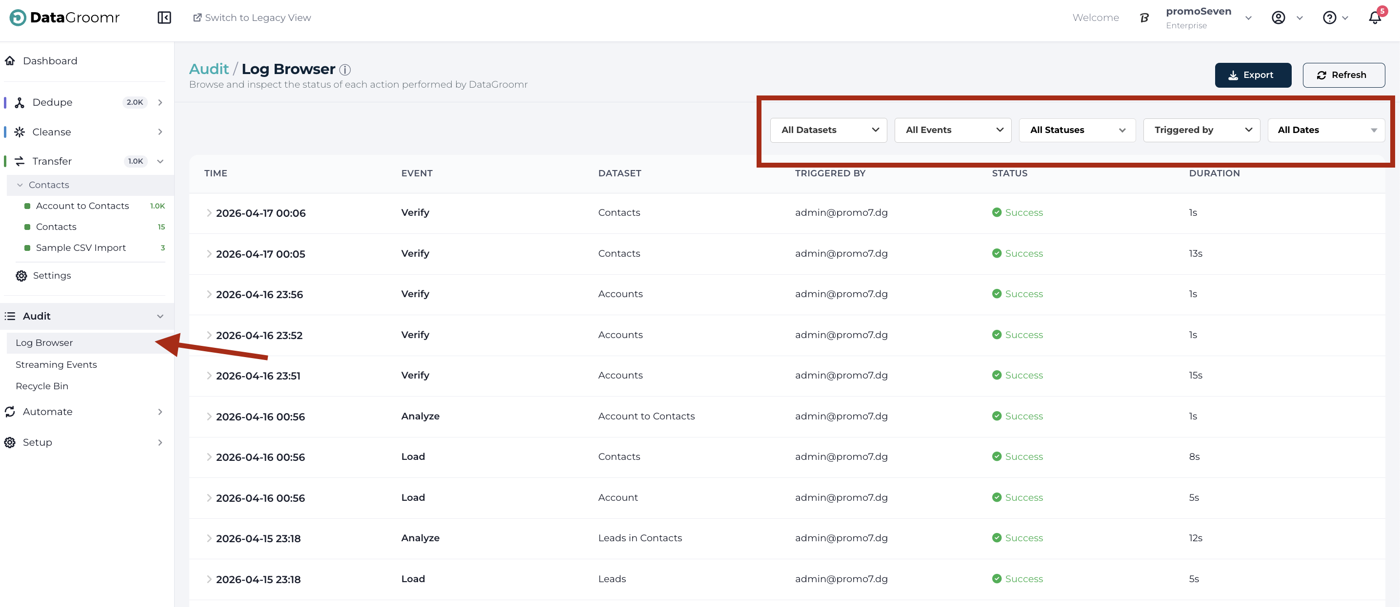 DataGroomr’s Log Browser offers a detailed review of all actions executed inside the application. Each event shown in the list can be expanded to review details. Users can also filter to identify specific activities that may be of interest.