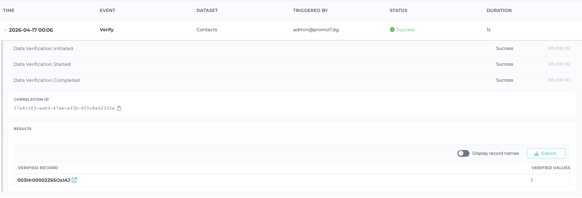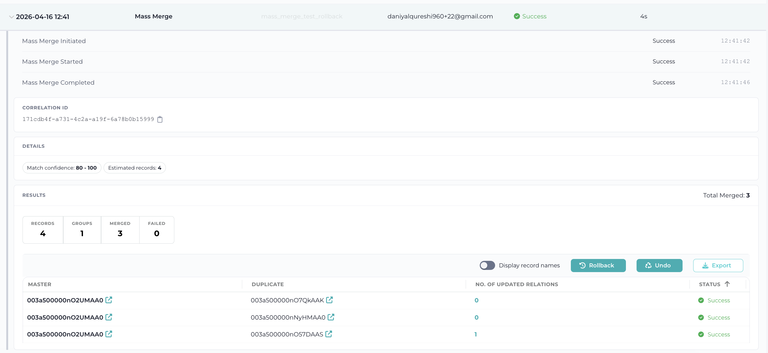 - Merge – records merge executed (Dedupe)