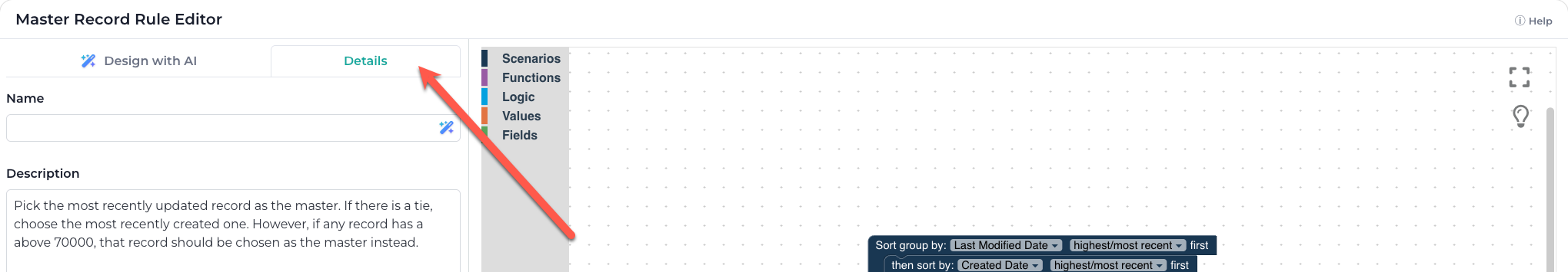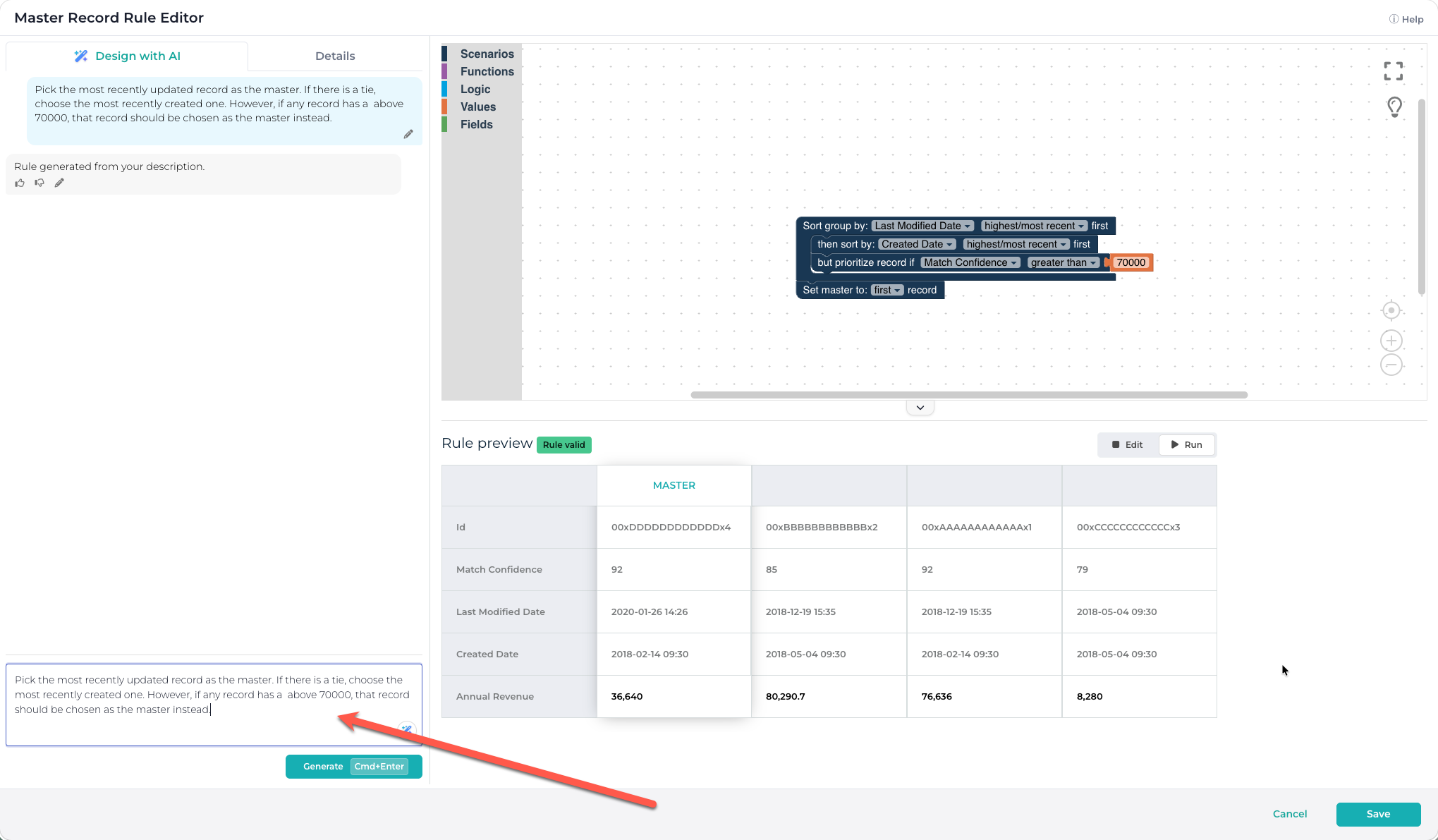 Our recommended approach to create Master Record Rules using the AI Assitant.