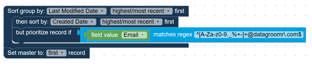 In the example below, the rule guarantees that if there is a duplicate record with email address from datagroomr.com domain - it will be chosen as a surviving record:
