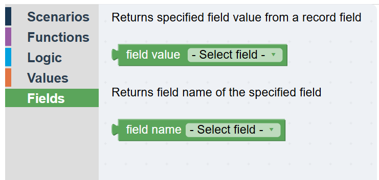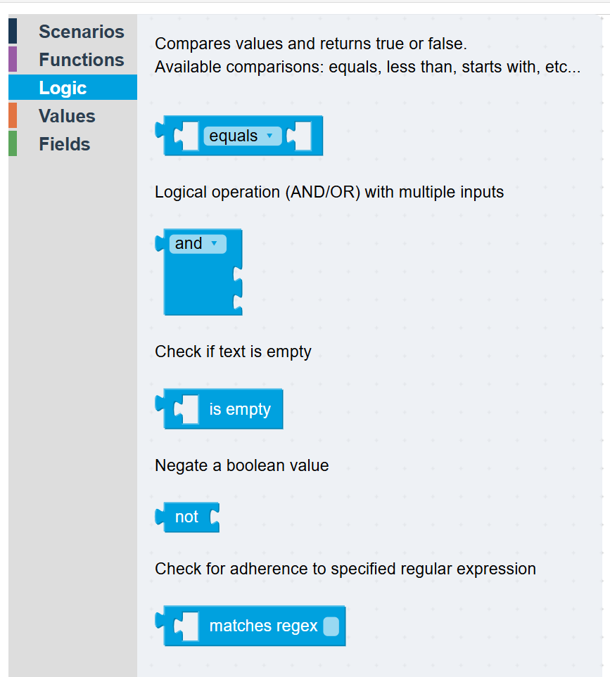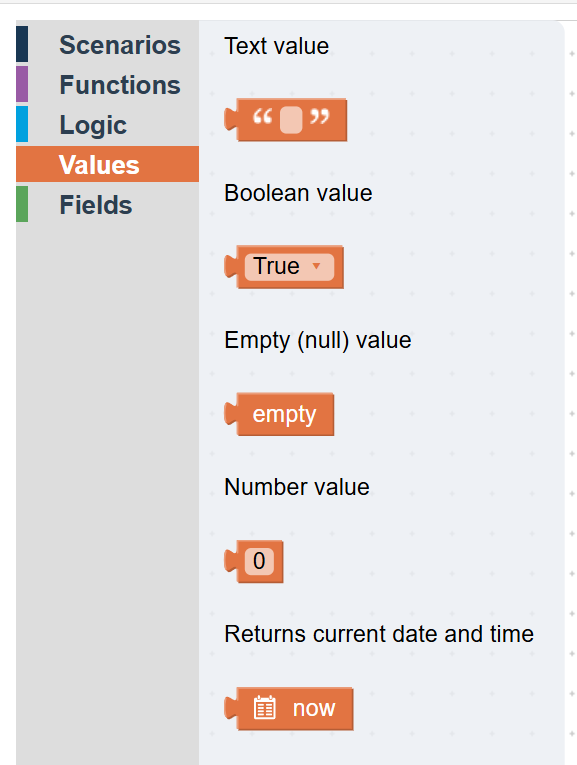 Values section contains blocks with plain values of Text, True/False, Empty(Null), Number, Current DateTime. These blocks can be used in connection with other blocks.