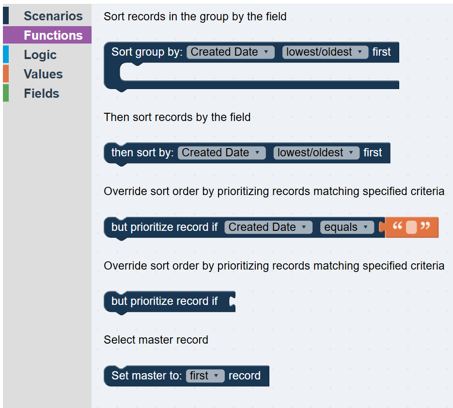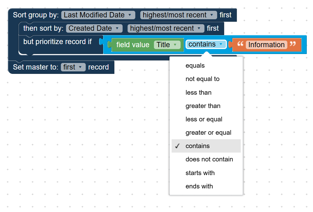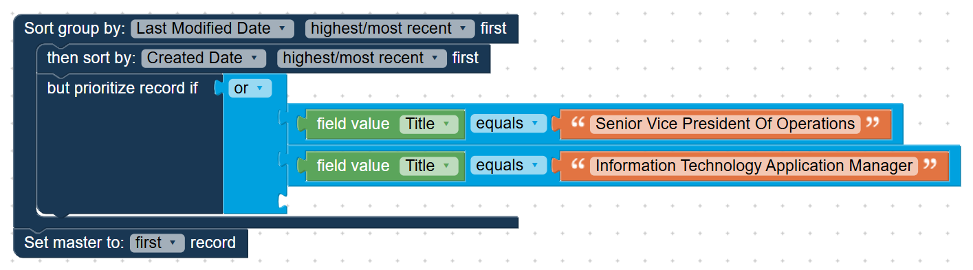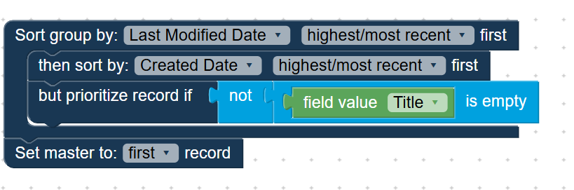 BUT PRIORITIZE RECORD IF - it allows to prioritize record by logic condition using quite complicated scenarios and combining different functions together. For example, mainly you want to sort the matched group by Last Modified, Created dates but if there is a record with Title from the list - you want to set this record as a master record: