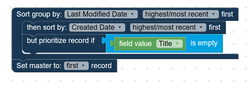 BUT PRIORITIZE RECORD IF [FIELD] [CONDITION] - it allows to prioritize the record from the matched group by some specific condition regardless of the main sort order. For example, mainly you want to sort the matched group by Last Modified, Created dates but if there is a record with Match Confidence greater than 90- you want to set this record as a master record: