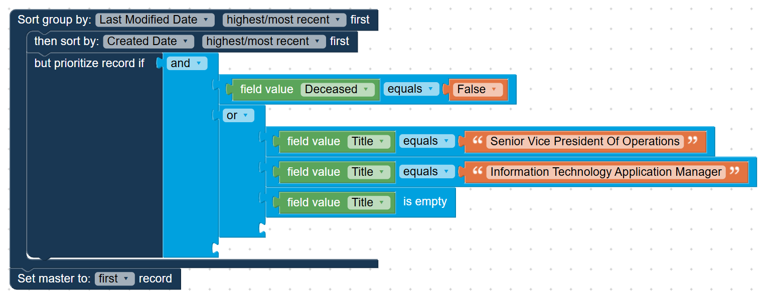 In the example below, the rule will prioritize the record if it has False in Deceased field and Title has one of the values specified: