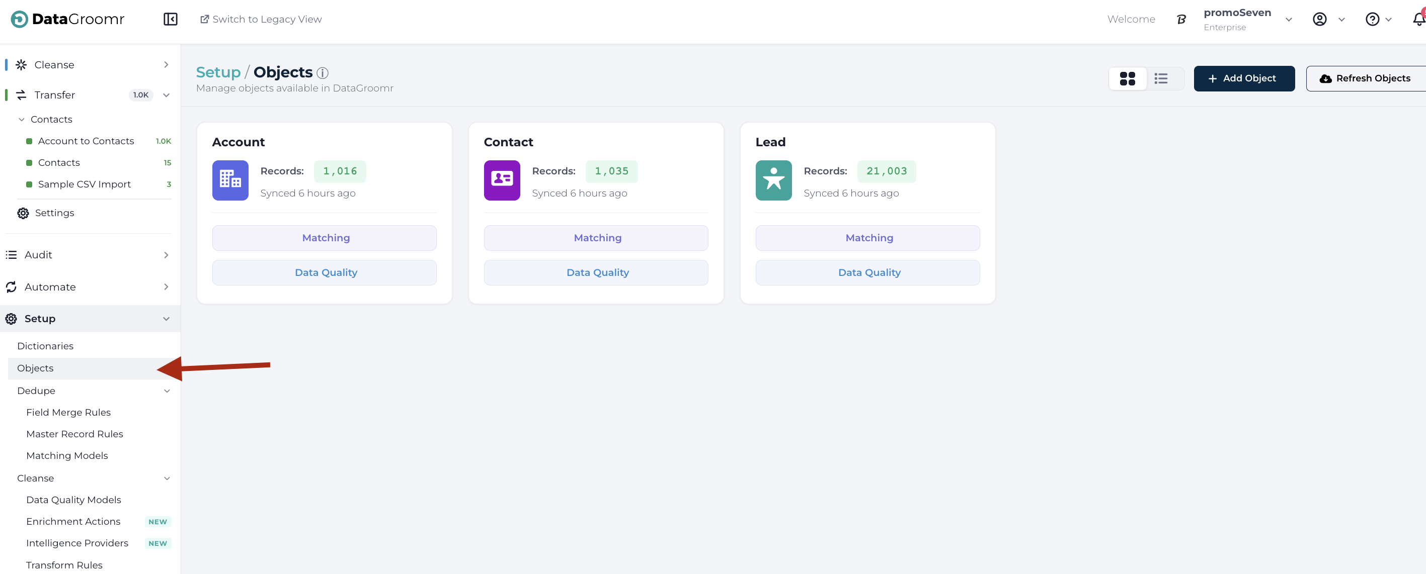 In order to select which objects DataGroomr works with press Objects link located under the Setup section in the Navigation Menu.