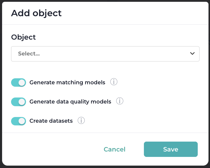 Adding a new object in Setup gives you quick toggles to spin up matching models, DQ models, and starter datasets in one step.