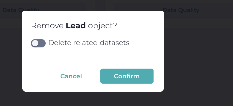 The Delete related datasets option will automatically remove datasets from DataGroomr that use this object. Press Confirm to delete.