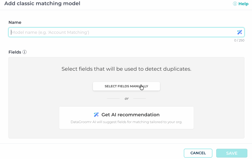 Selecting either model option will open a dialog that includes the following elements, giving you the option to manually select fields or let AI infer most suitable fields for your object based on the best practices and the statistics of the data population.