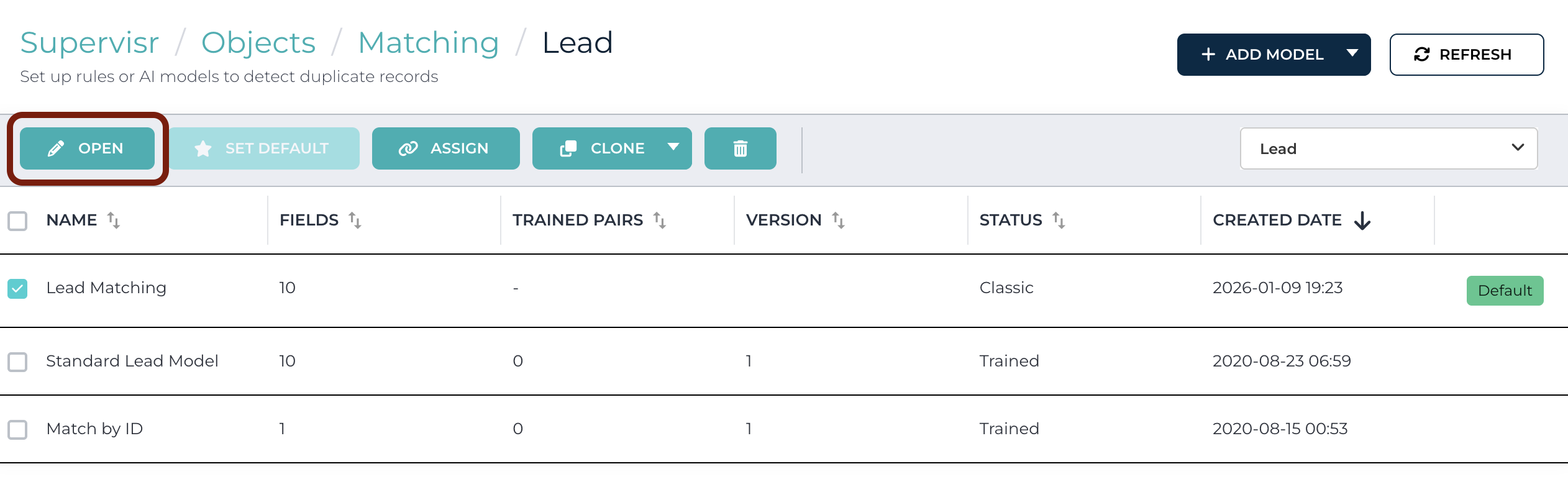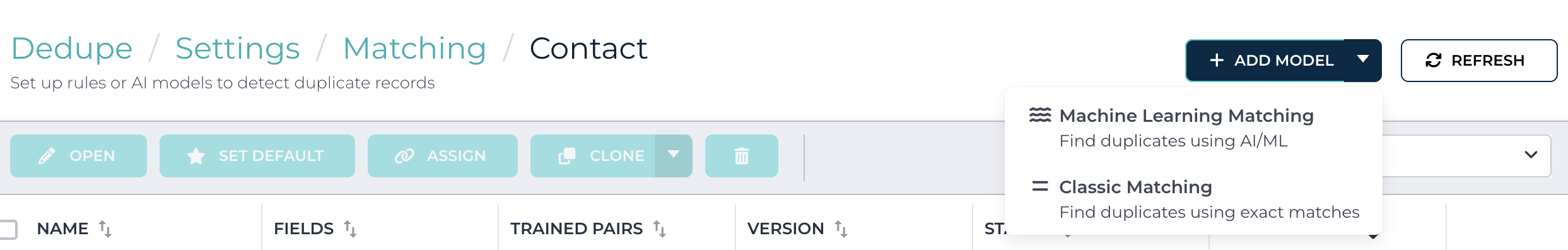 Classic matching models and trained machine learning models can be assigned to datasets or can be designated as default model for your organization.