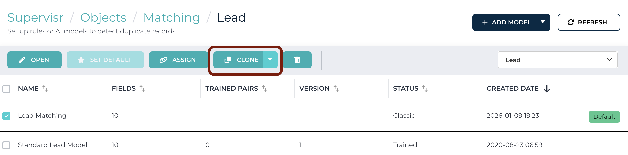 Occasionally you may need to modify or retrain an existing matching model.  For example, you may need to remove or add a field.  However, an existing model cannot be changed this way, but you can create a copy that can be edited.
