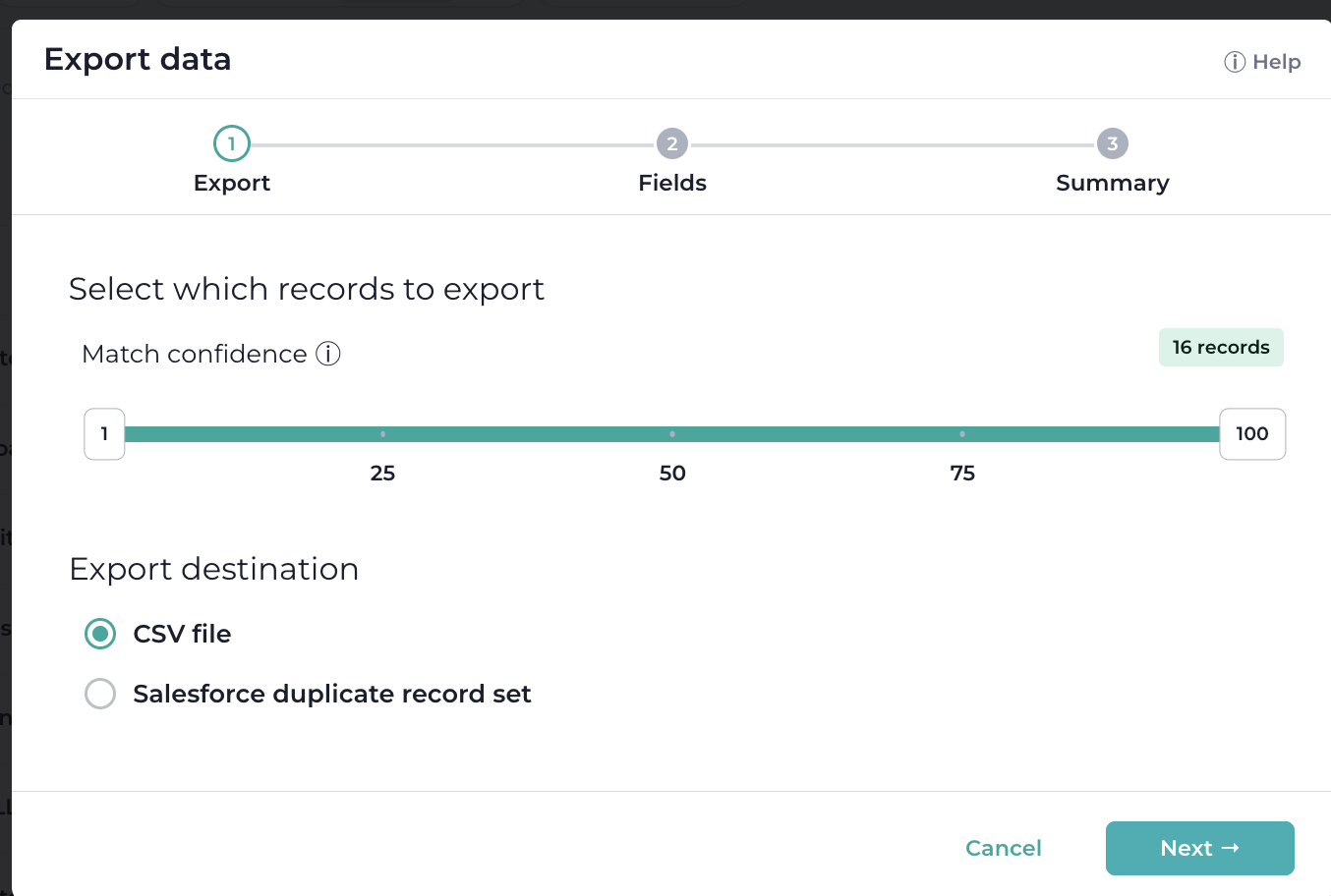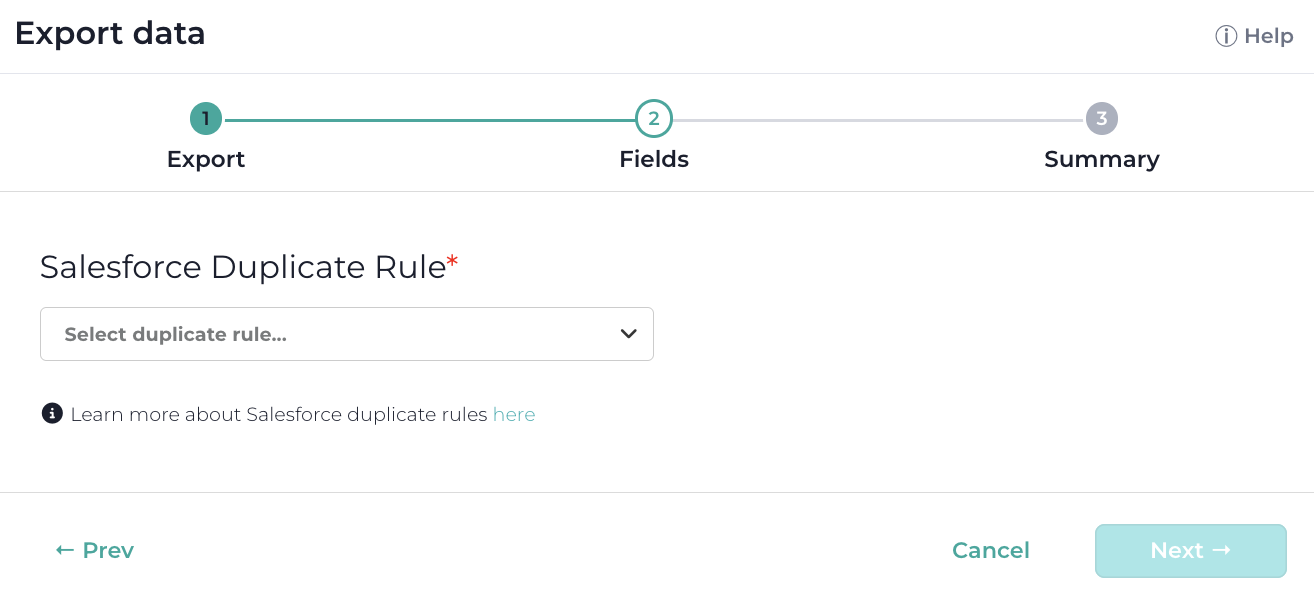 Allows to export records as Salesforce Duplicate Record Sets. Selecting this option brings up a dialog to select desired match confidence and a duplicate rule from Salesforce.