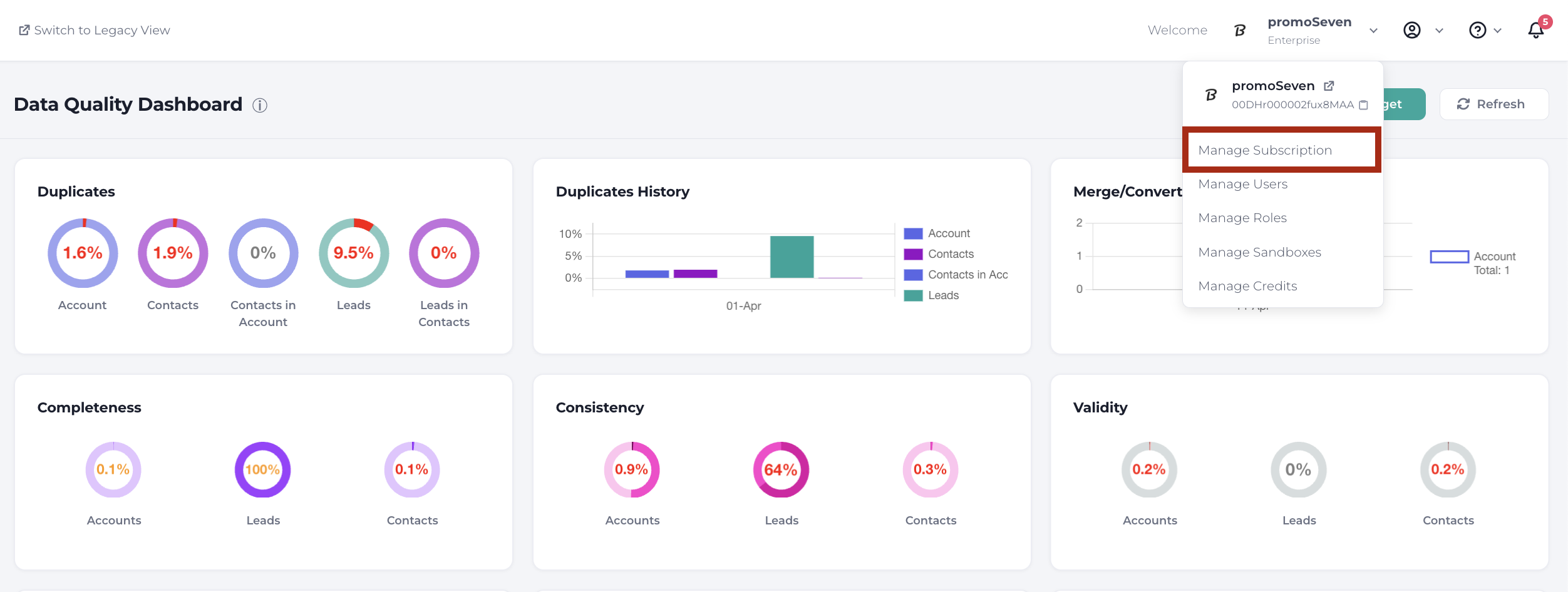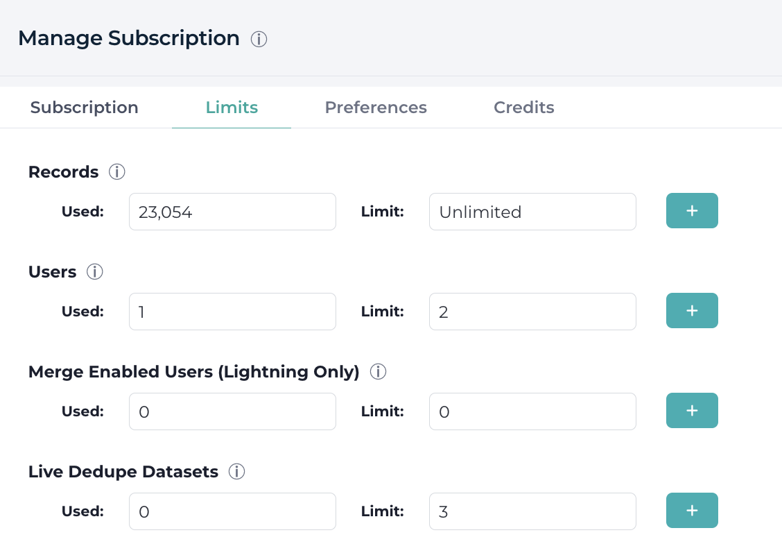 The subscription dashboard includes information about your current subscription, including the number of records used/available and the number of users used vs available.
