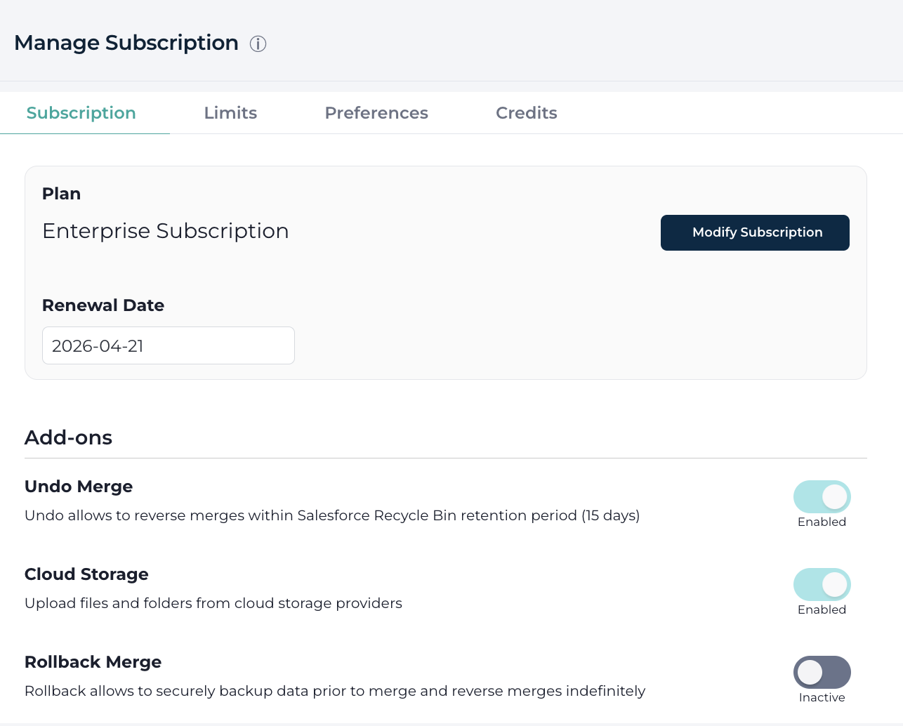 Subscription – Displays plan type, renewal information, and billing status.