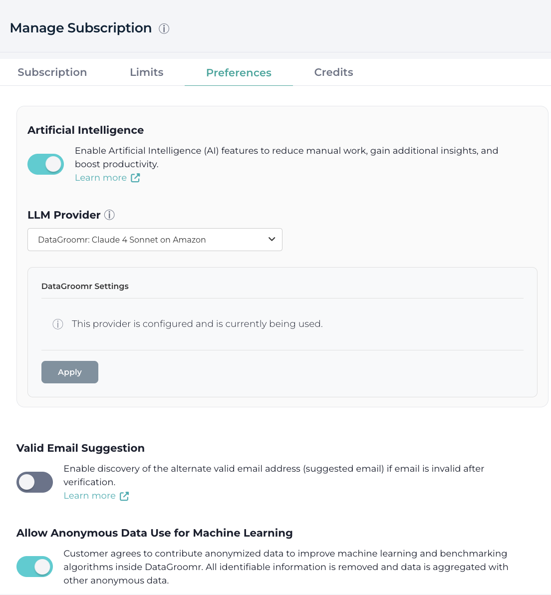 - DataGroomr AI credits are not consumed for operations handled by your own model