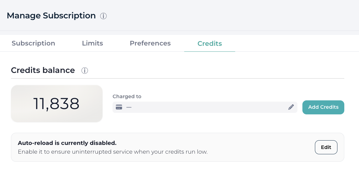 Credits – Displays remaining credits, consumption history, and direct links to purchase more.
