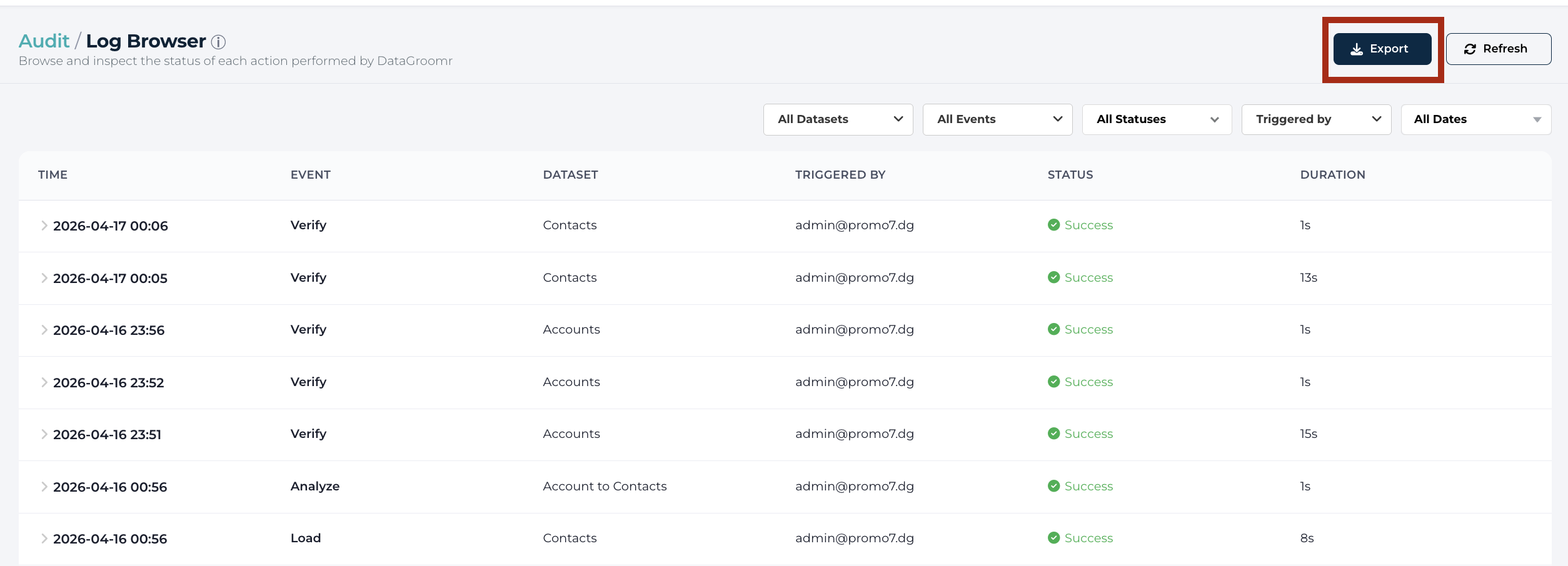 There are two option for exporting activity logs in DataGroomr.