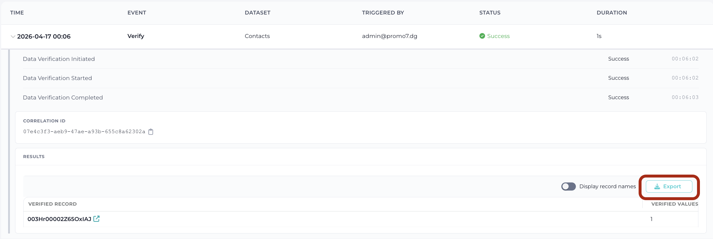 2) User may export certain individual events (e.g. individual or mass merge) using the provided EXPORT button inside the event.