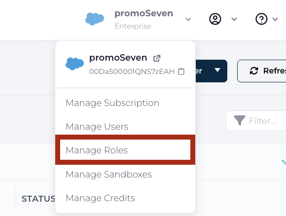 Roles allow administrators to manage access to modules and datasets inside the DataGroomr App.  The Managing Roles option can be accessed using the dropdown arrow in the Org section (top status bar).