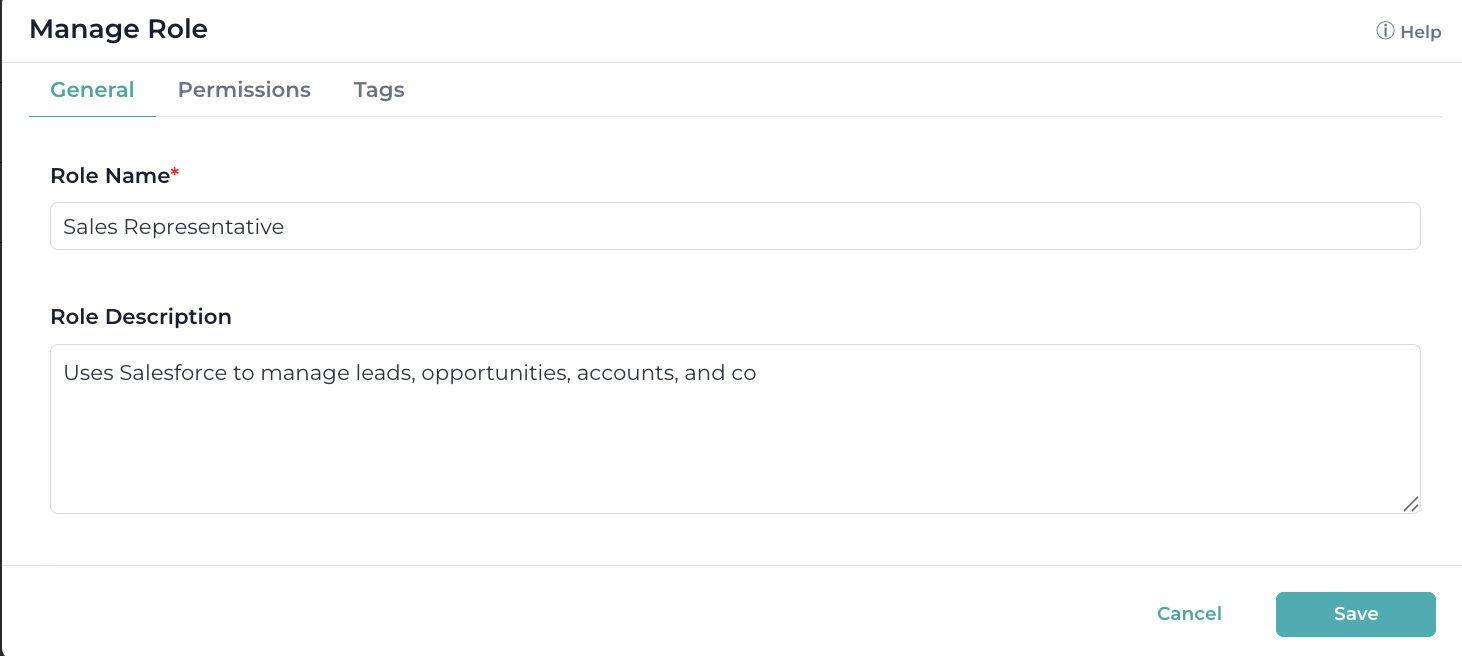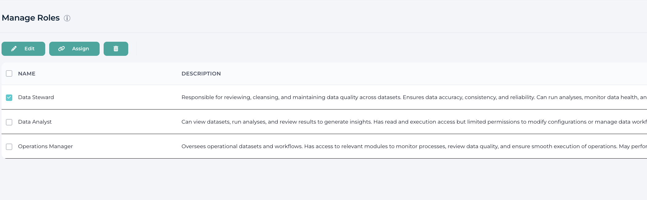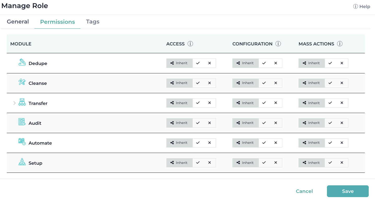 From here you can specify role name and create permissions to access DataGroomr modules and the datasets inside them.