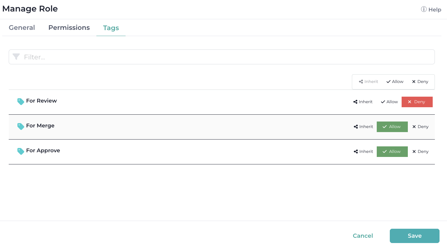 On the Tags tab, you may specify which tags a role has access to add/remove to a group in Trimmr. The following example allows a role access to "Approved" and "Approved by HR" tags and restricts access to all other tags.