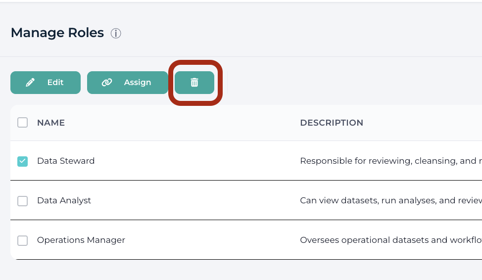 To delete a role, locate the role in the list and select the checkbox next to the role name. Multiple roles can be selected at once using the checkboxes. After selecting the desired roles, click the Delete button to remove them.