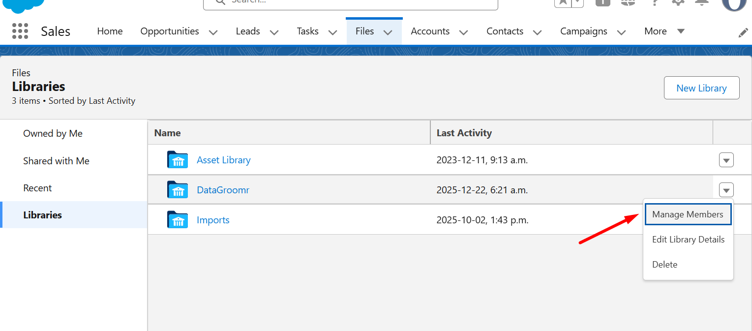 Navigate to Files > Libraries, locate DataGroomr library and click Manage Members.