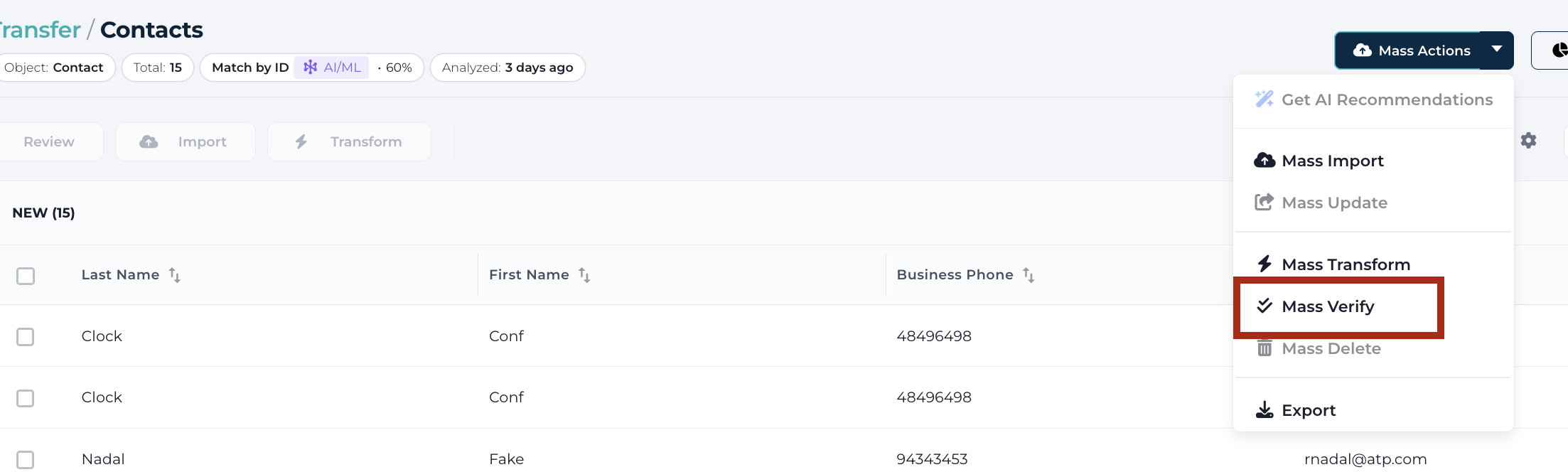 Start by selecting the Mass Verify option from the Transfer dataset.