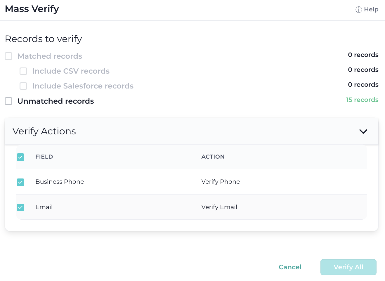 In the dialogue window, you can select the records that will be verified. Also, you can exclude or include fields that will be verified. Mass Verify now processes every record in the dataset, ensuring none are left unverified.