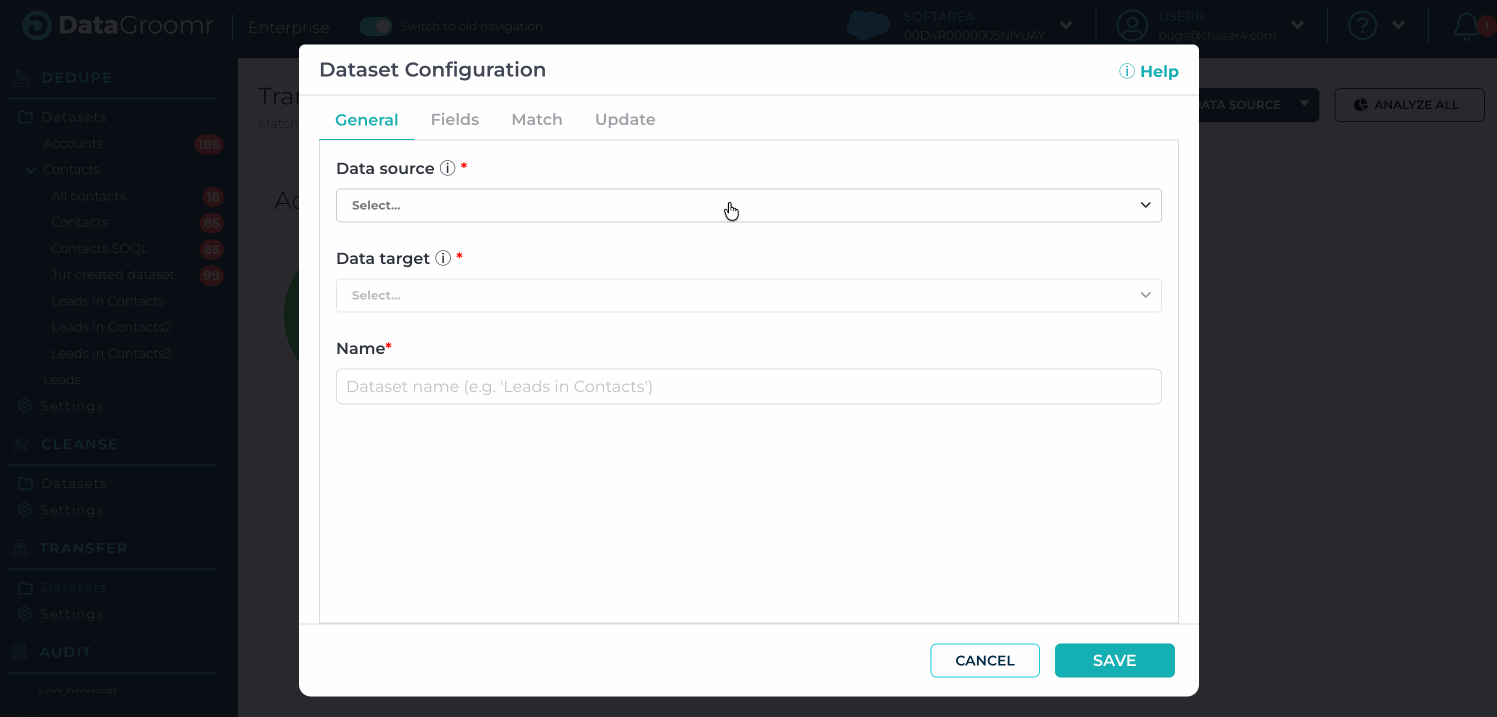 Create dataset dialog will appear. Datasets can be created by selecting Salesforce objects or previously created datasets in Data source and Data target options. Review the name, which is automatically populated but can be edited if needed.