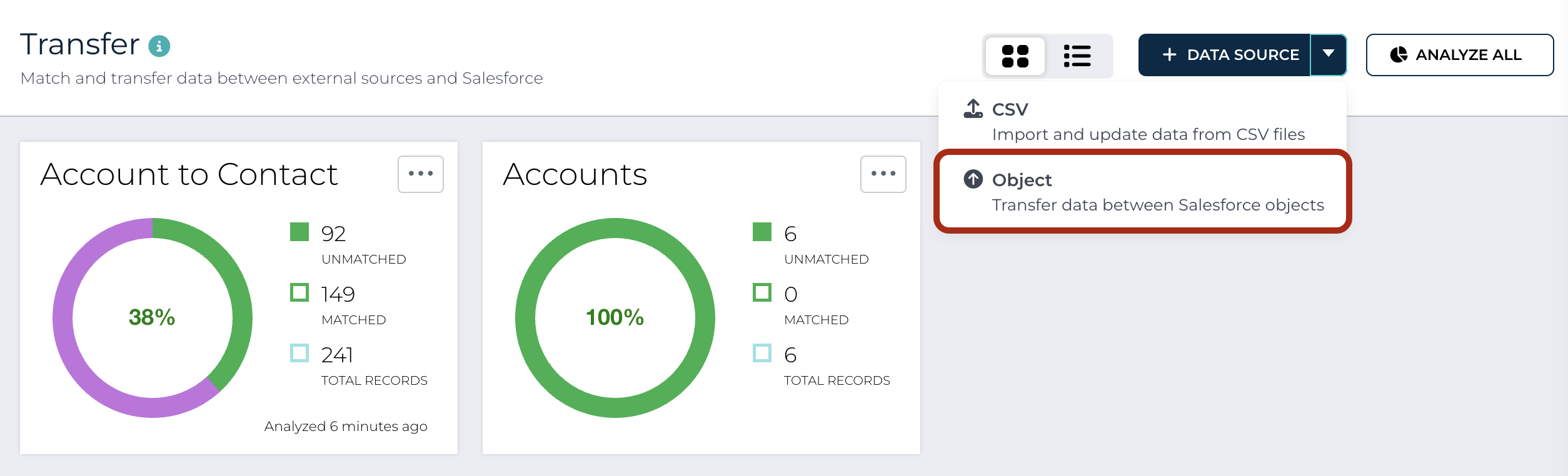 The Transfer module allows users to copy data between Salesforce Objects. It prevents duplicates from being created in the target Salesforce object as a result of import by updating existing records when information is found in another object data source.