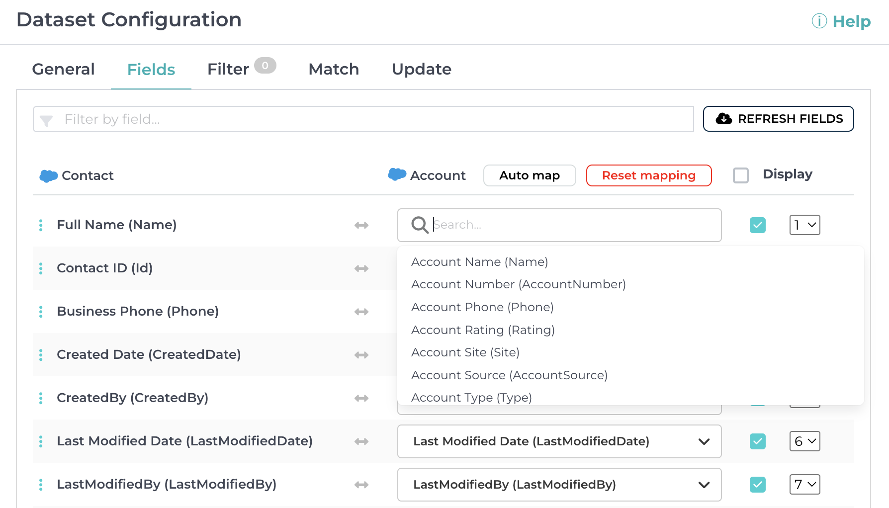 - Mass Update - Update existing records in the target record with values from the source record using the merge and field mappings defined in the dataset configuration menu.