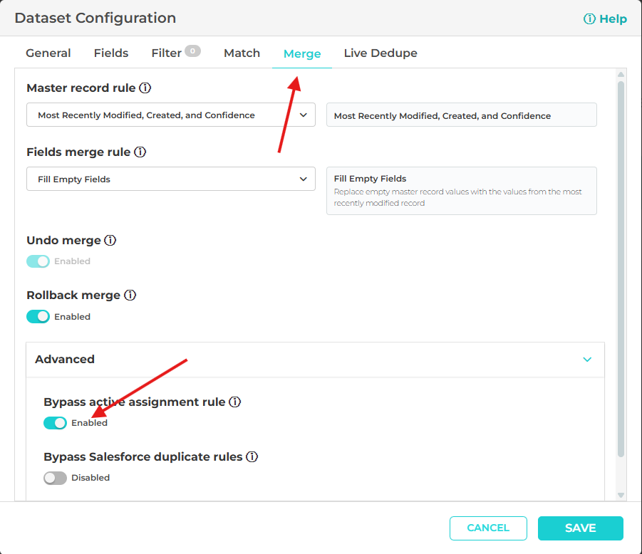 Merge Rules (Tab)>Advanced (Section) >Bypass active assignment rule/Bypass Merge Rules
