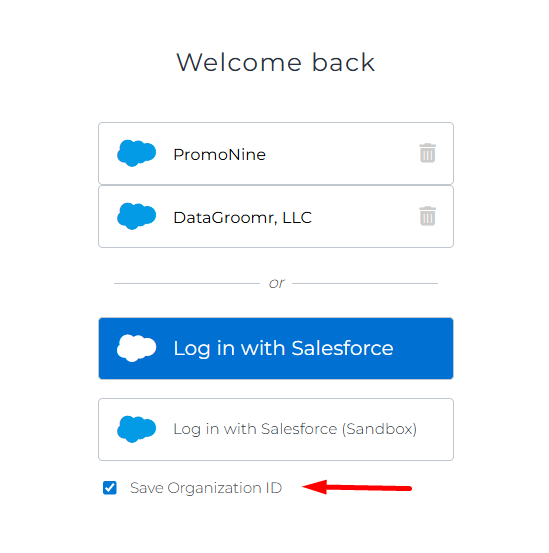 When you log in using Log in with Salesforce (or Salesforce Sandbox), you’ll see an option labeled Save Organization ID.