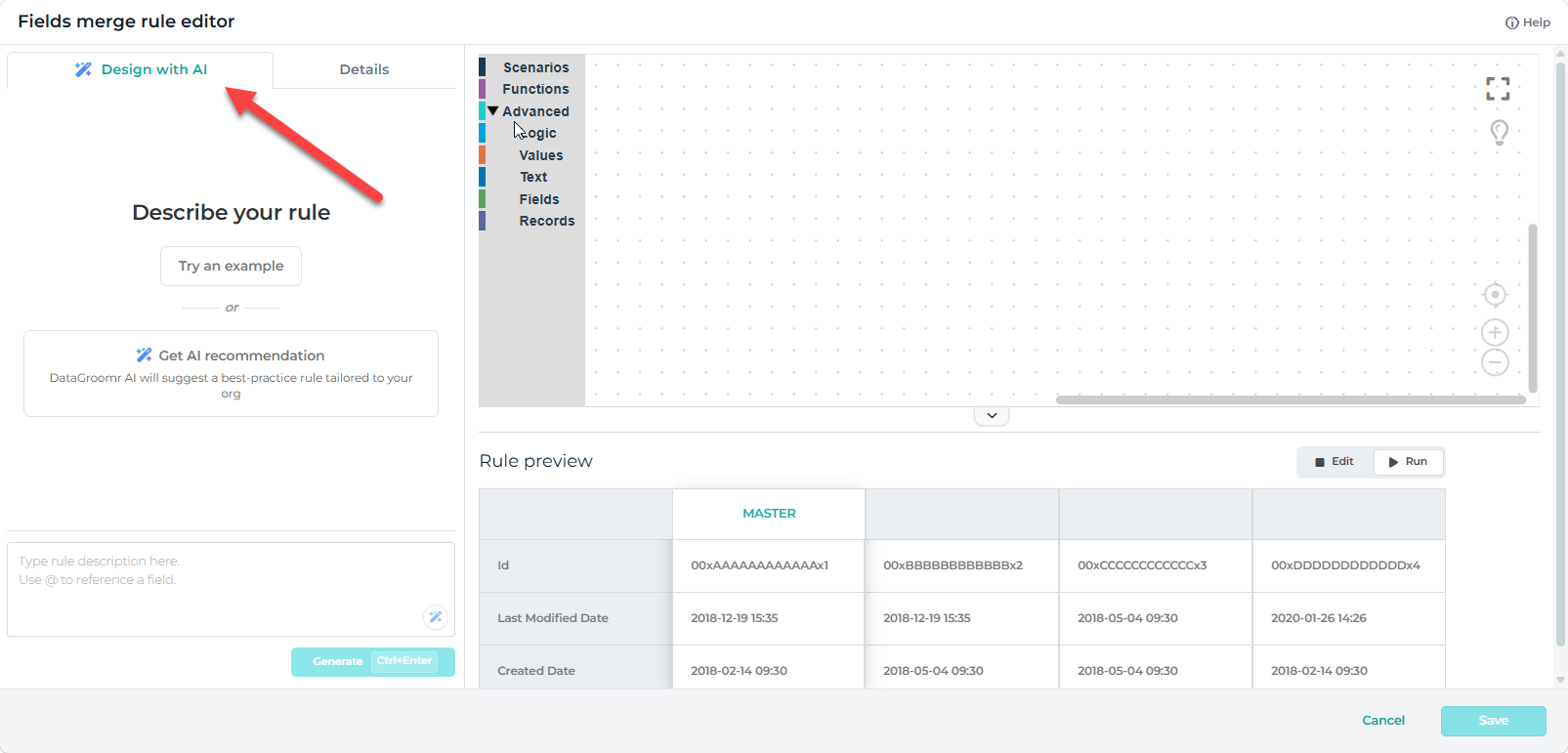 AI-generated merge rules help you create effective merge logic without starting from scratch. When enabled, DataGroomr uses AI to analyze your Salesforce org and suggest merge rules that align with your data structure and common best practices.