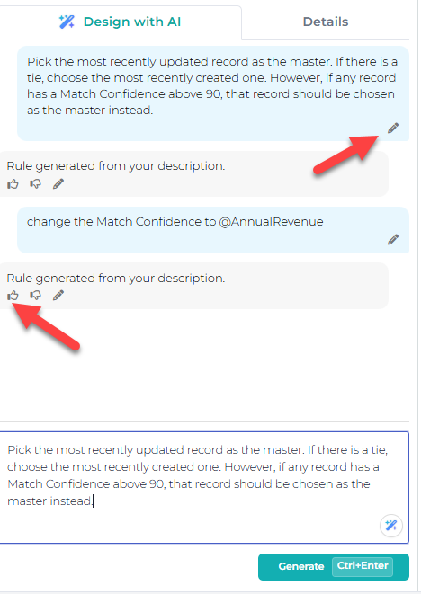 Modify an existing rule or write a new description to guide the logic you want generated.