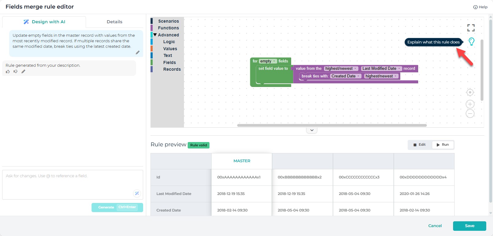 The AI considers your org's metadata, including field types and permissions, as well as standard data quality principles such as prioritizing complete, recent, and verified values. The generated rules serve as a recommended starting point and can be reviewed, modified, or extended to meet your specific requirements.