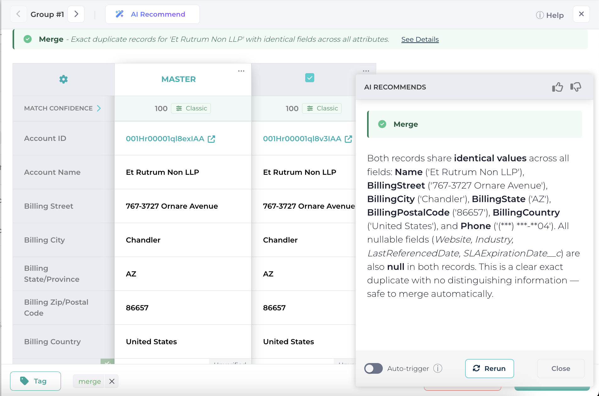 Once models have identified groups of potential duplicates, AI Recommendations streamline the next step: deciding what to do with those groups. Instead of manually inspecting every set, you can request AI suggestions for single or multiple groups at once. The system proposes actions such as merge, split, link or hold for manual review, along with reasoning that explains why it recommends that choice.