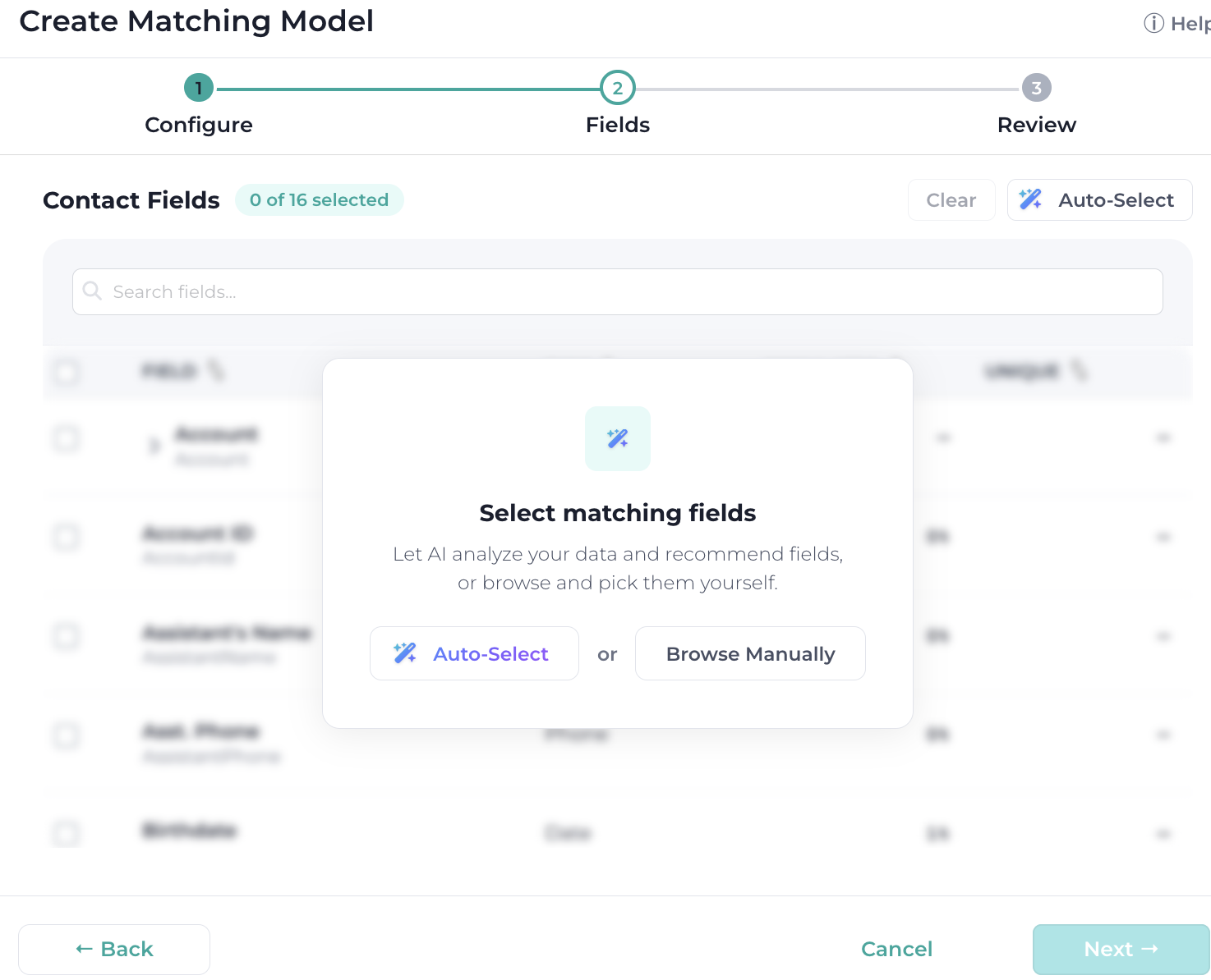 On initial onboarding or when customizing, for faster setup, the Auto-Select option can suggest fields to include based on your data. Models can be cloned to make variations so you can retrain without losing older configurations. Once created, models are assigned to datasets or set as defaults, ensuring consistent logic is applied across all deduplication work. This flexibility allows you to fine-tune accuracy, adapt quickly as data structures evolve, and maintain reliable duplicate detection at scale.