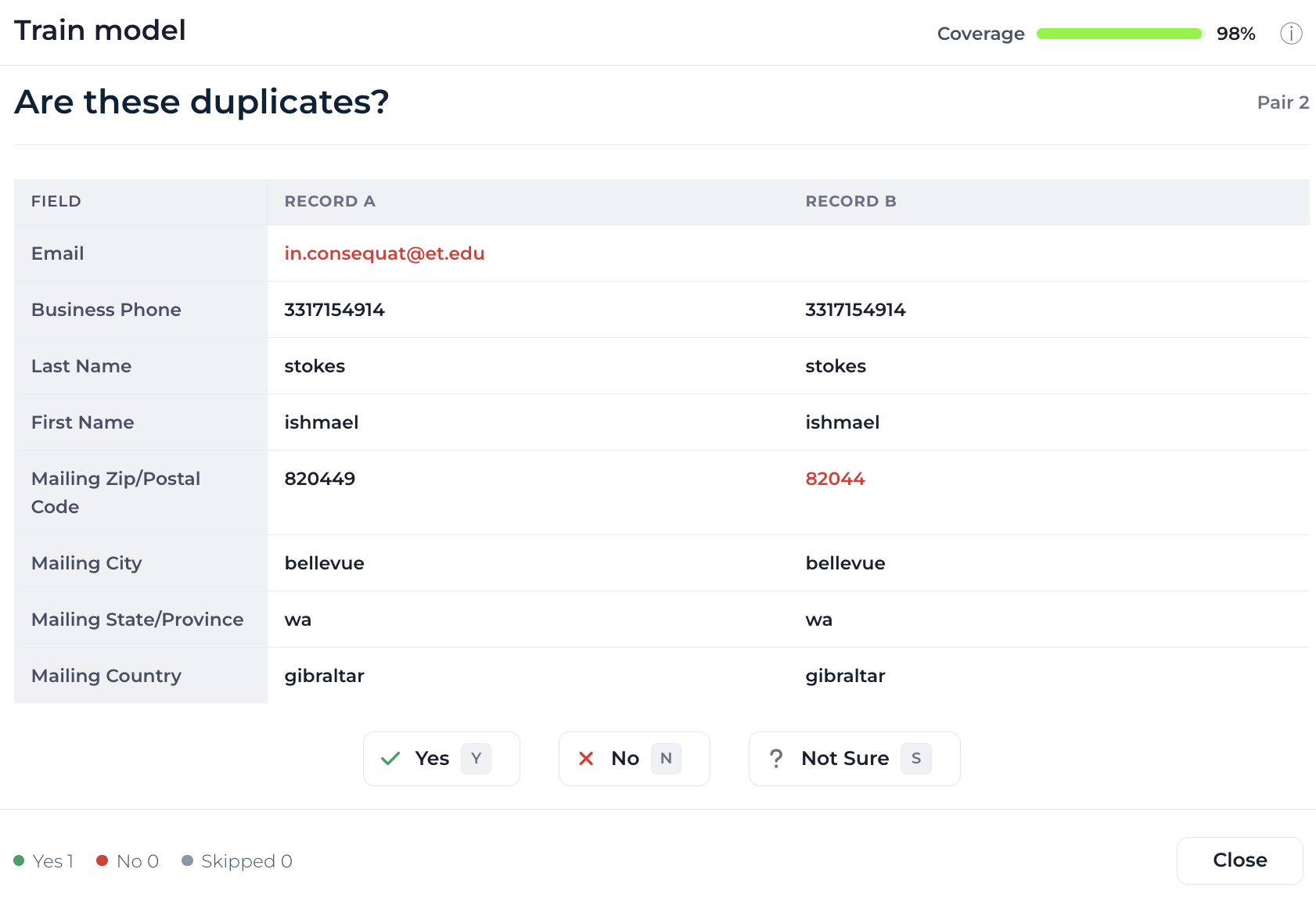 Machine learning matching models can be trained either manually or with the help of the AI Assistant. In manual mode, you label record pairs as duplicates or not, teaching the model to recognize patterns in your data. The AI Assistant, on the other hand, automates much of this training and fine-tuning, reducing the effort required when working with large or messy datasets.