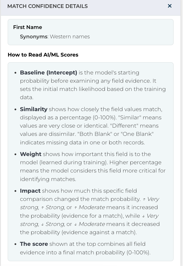 The AI/ML Matching Model calculates Match Confidence by evaluating evidence from multiple fields. Each field comparison can either increase or decrease the likelihood that the records represent the same entity.