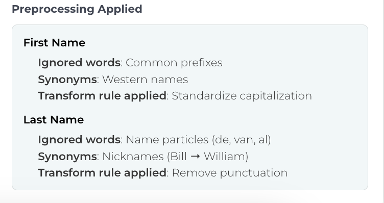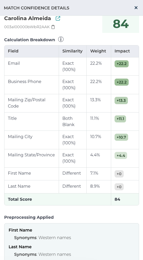 If configured DataGroomr will apply selected preprocessing steps to standardize values and improve matching accuracy. These adjustments will be shown in the Preprocessing Applied section of the Match Confidence Details panel.