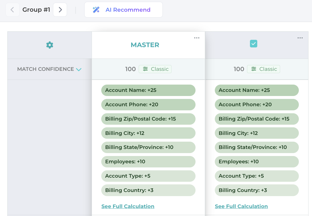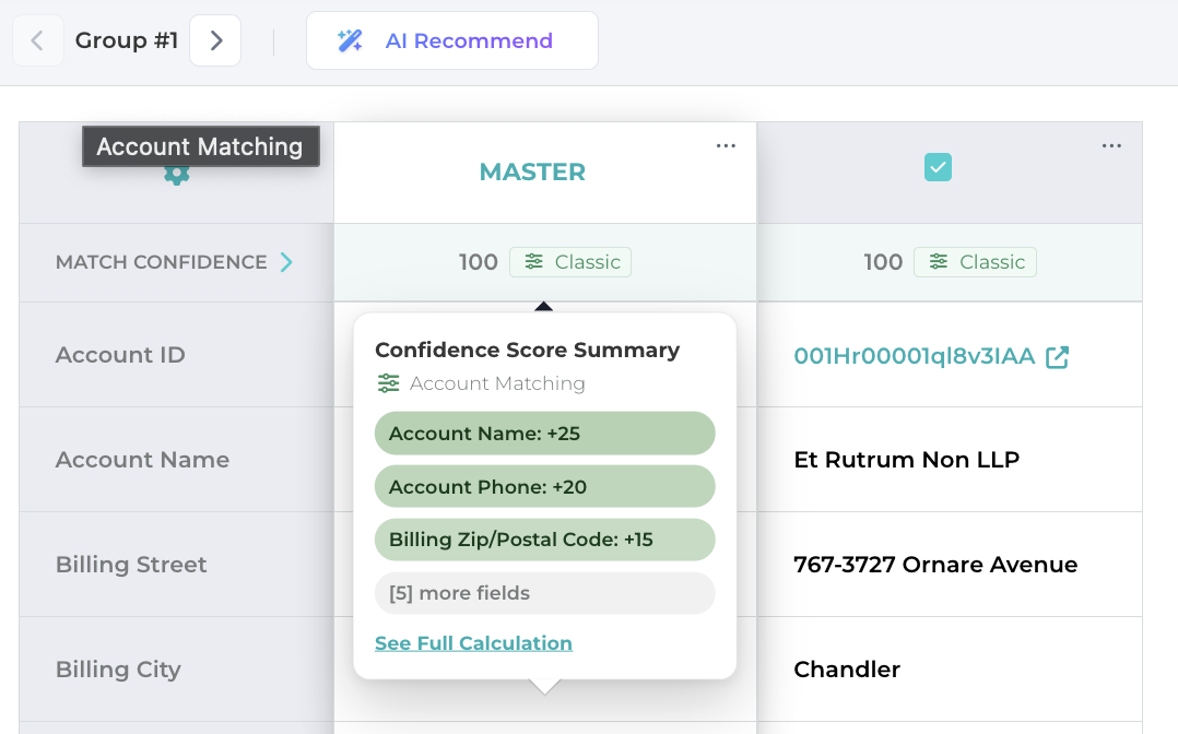 Match Confidence indicates how strongly DataGroomr believes that records in a duplicate group represent the same entity. The score is calculated by comparing values across multiple fields by evaluating how closely those values match. Each duplicate group receives a Match Confidence score to help determine whether records should be merged, reviewed, or left unmatched. The match breakdown is available for AI/ML Matching Model and Classic Matching Model.