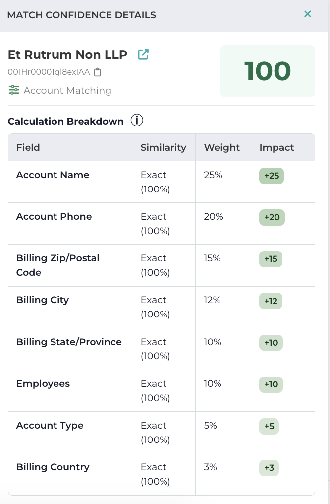 For a deeper understanding of how the Match Confidence score was calculated, select See Full Calculation. This opens the Match Confidence Details panel. This panel provides the most detailed view of the matching process. It shows how each field or component contributed to the final Match Confidence score.