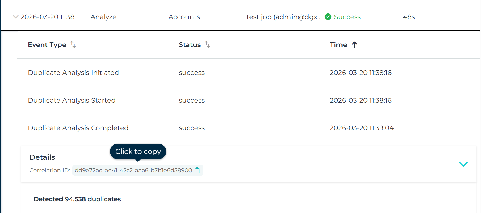 Identify the event you are experiencing issues with (such as Analyze, Merge, etc.) either manually or by utilizing the filters available on the page, and expand the record to retrieve the CorrelationID: